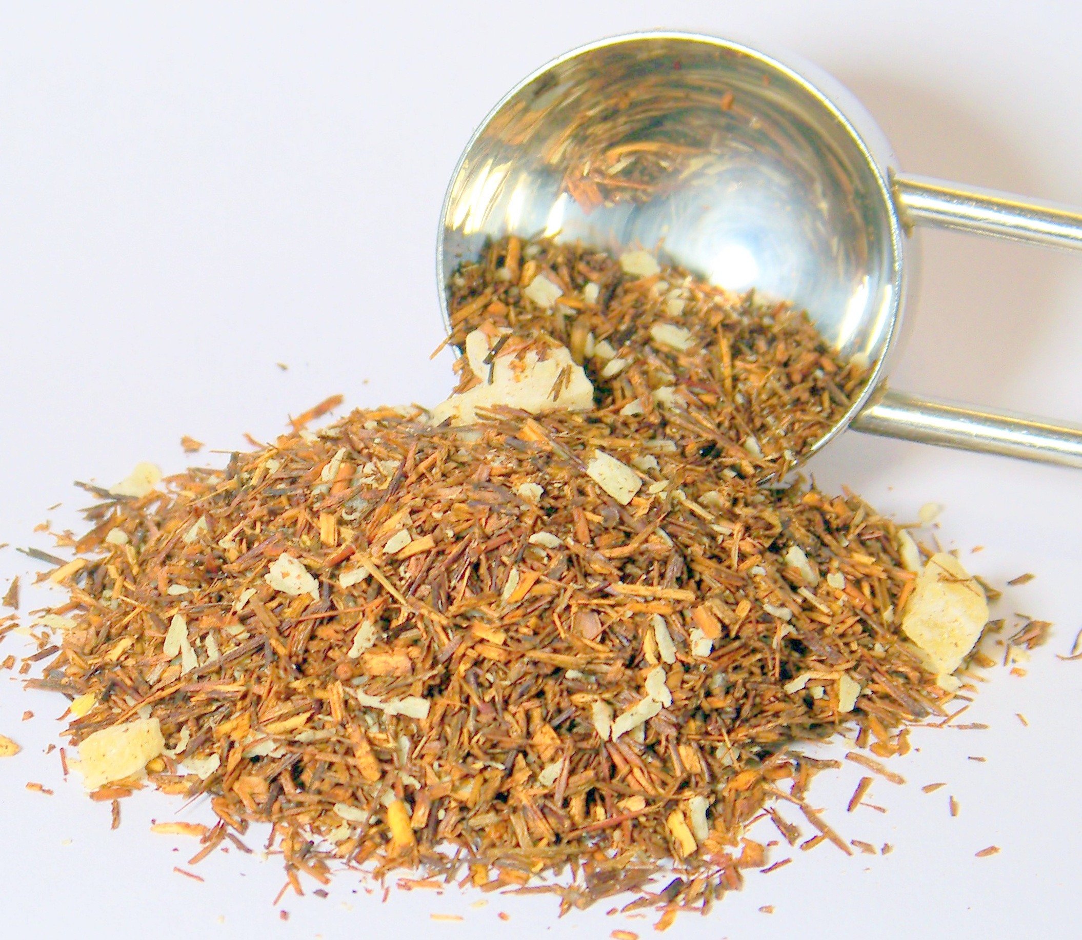 Rotbusch Tee mit Pfirsichstückchen und Sonnenblumenblüten.