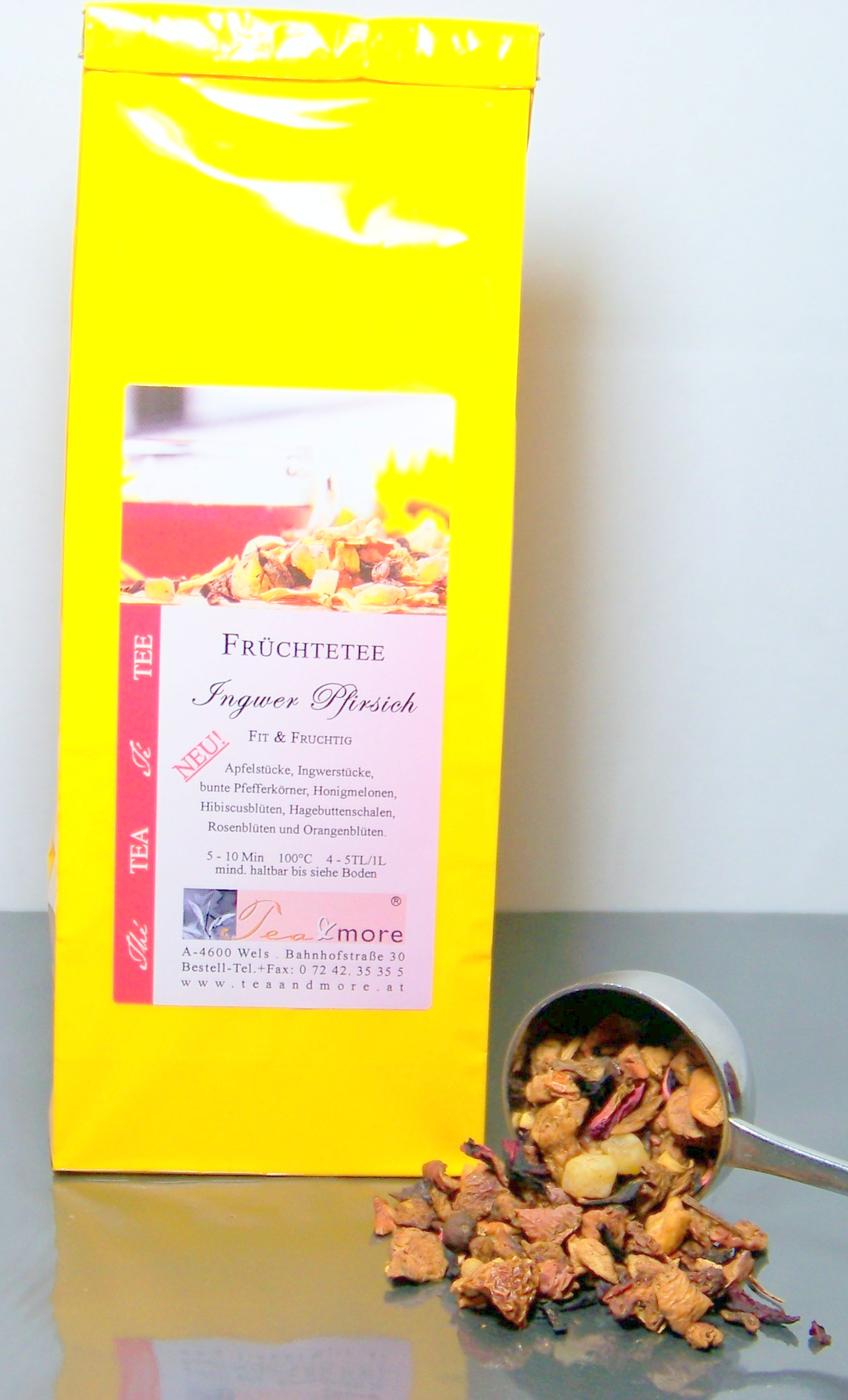 Apfelstücke, Ingwerstücke, bunte Pfefferkörner, Honigmelonen, Hibiscusblüten, Hagebuttenschalen, Rosenblüten und Orangenblüten