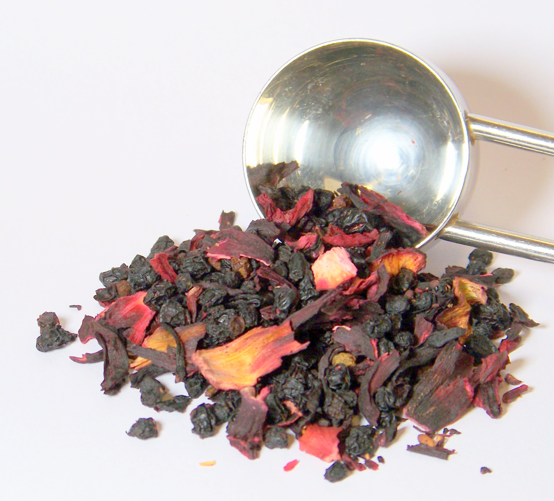 Eine Früchtetee-Mischung der Extraklasse. Papayawürfel, Hibiskusblüten, Korinthen, rote und schwarze Johannisbeeren, Heidelbeeren, Fliederbeeren, Himbeer- und Erdbeerstücke.