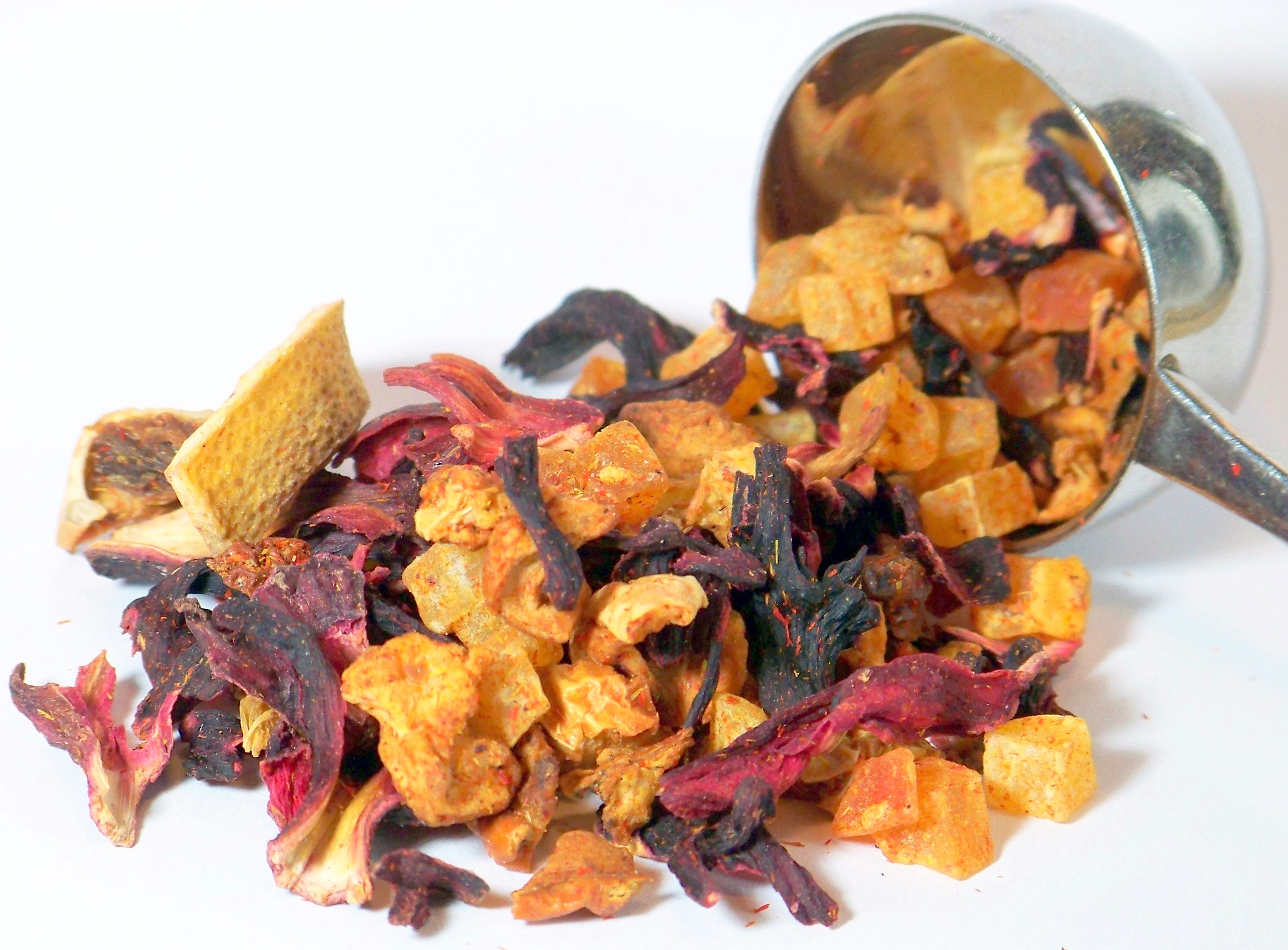 Eine Früchtetee-Mischung der Extraklasse. Papayawürfel, Hibiskusblüten, Korinthen, rote und schwarze Johannisbeeren, Heidelbeeren, Fliederbeeren, Himbeer- und Erdbeerstücke.