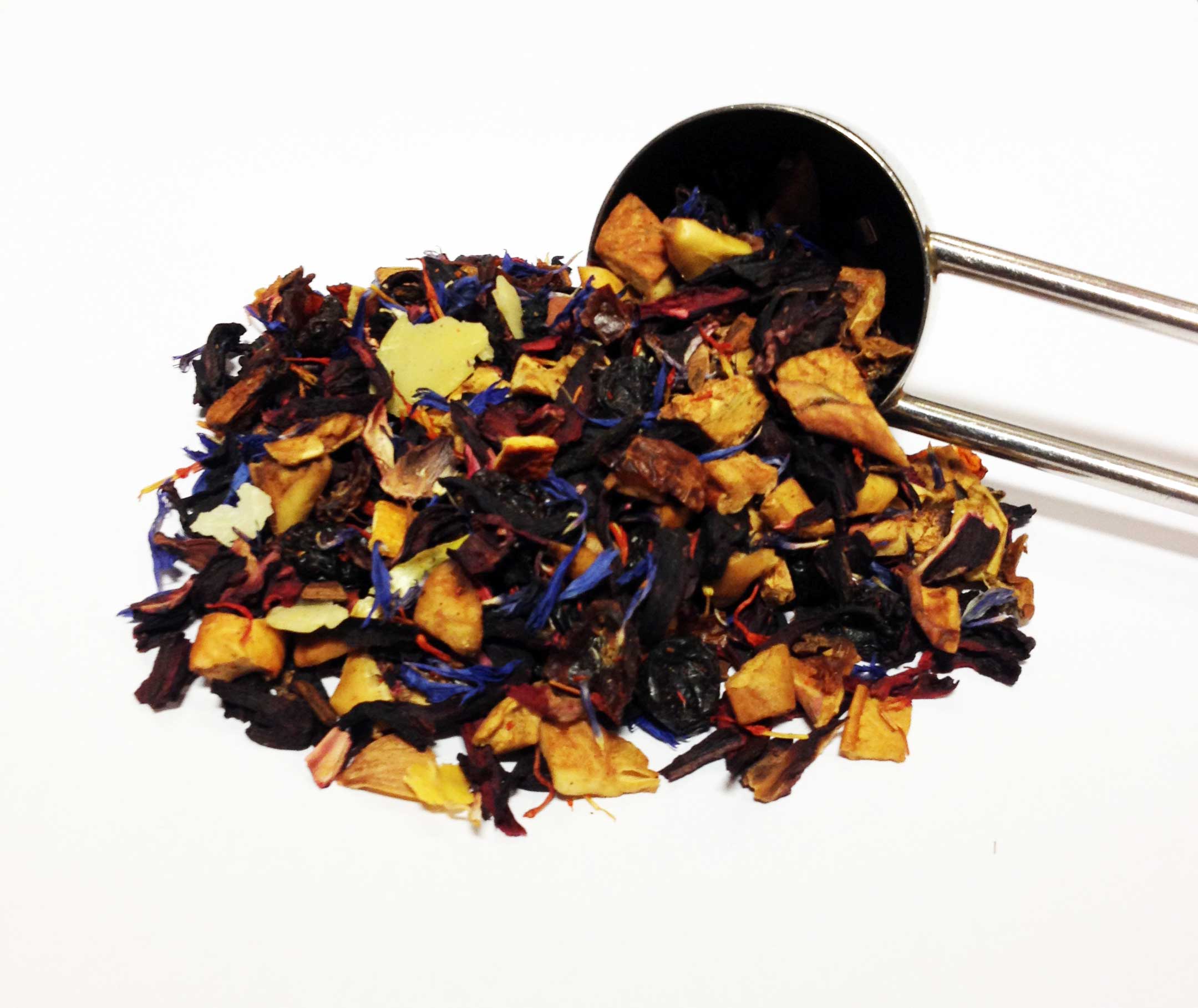 Zutaten: Hagebuttenschalen, Hibiscusblüten, Apfelstücke, Zimtstücke, Mandelstücke, Vanillestücke, Heidelbeeren, Nelken, Holunderbeeren, Färberdisteln, Kornblumenblüten, Korinthen, Orangenschalen. Natürliches Aroma von Amaretto-Ananas-Zimt.