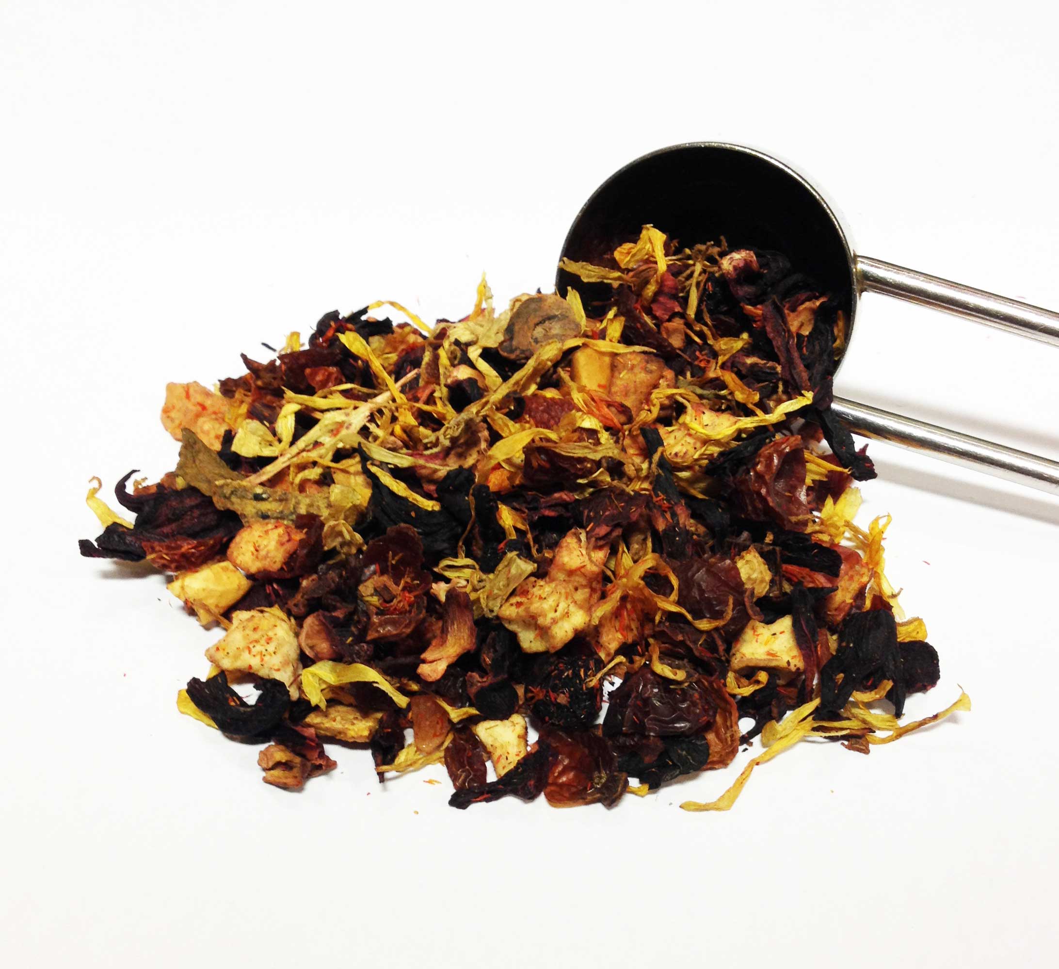 Zutaten: Hibiscusblüten, Orangenschalen, Zitronenschalen, Papayawürfel, Hagebuttenschalen, nur ein Hauch von Zimt, Apfelstücke, Ringelblumenblüten, Färbeldisteln, Heidelbeeren und Vanillestücke.